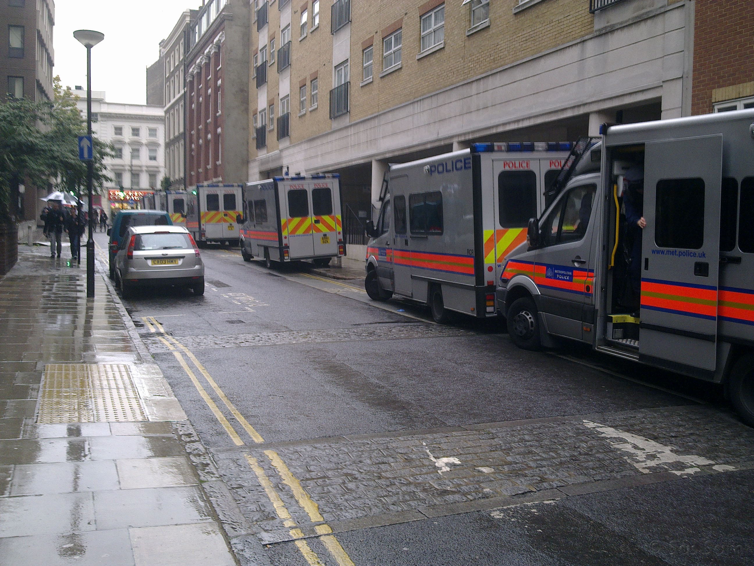 Ismét ebédidő, ismét séta a városban. Most annyi történt, hogy amint kifordultam a cég épületéből a kis utcára, ami kivisz a High Holborn-ra egy szokatlan látvány tárult a szemem elé. Nagyon nem akartam fényképezgetni, de az alábbi képen látható sort, még képzeljük el a másik irányba is, kb. másfélszer ilyen hosszan. Ugyan megkérdeztem, hogy akkor most kell-e kezdeni aggódni vagy mi történt, mivel az utca végén gyülekeztek nem kis létszámban az urak állig beöltözve golyóálló mellénybe meg vizicsúzlival a mellkasukon, de a válasz csak annyi volt, hogy nem kell megijedni, ez csak gyakorlat. Ettől nem tudom, hogy meg kellett volna-e nyugodni, mert a filmekben is mindig hasonlókat mondanak, mielőtt kitör a 3. világháború. :)